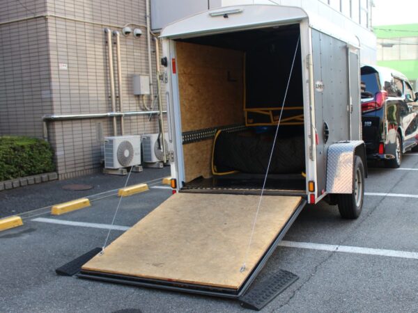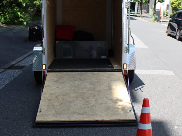 当方のカーゴトレーラーは、後部ドアを開ければそのドアがスロープになりますので、これにより、重たいものでもスムーズに積み降ろしが可能です。