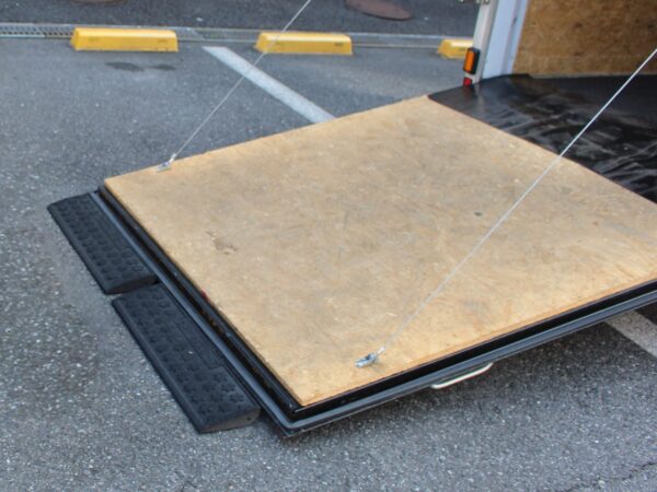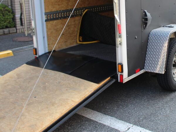 当方のカーゴトレーラーは、後部ドアを開ければそのドアがスロープになりますので、これにより、重たいものでもスムーズに積み降ろしが可能です。